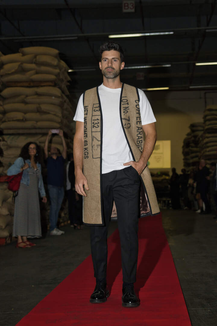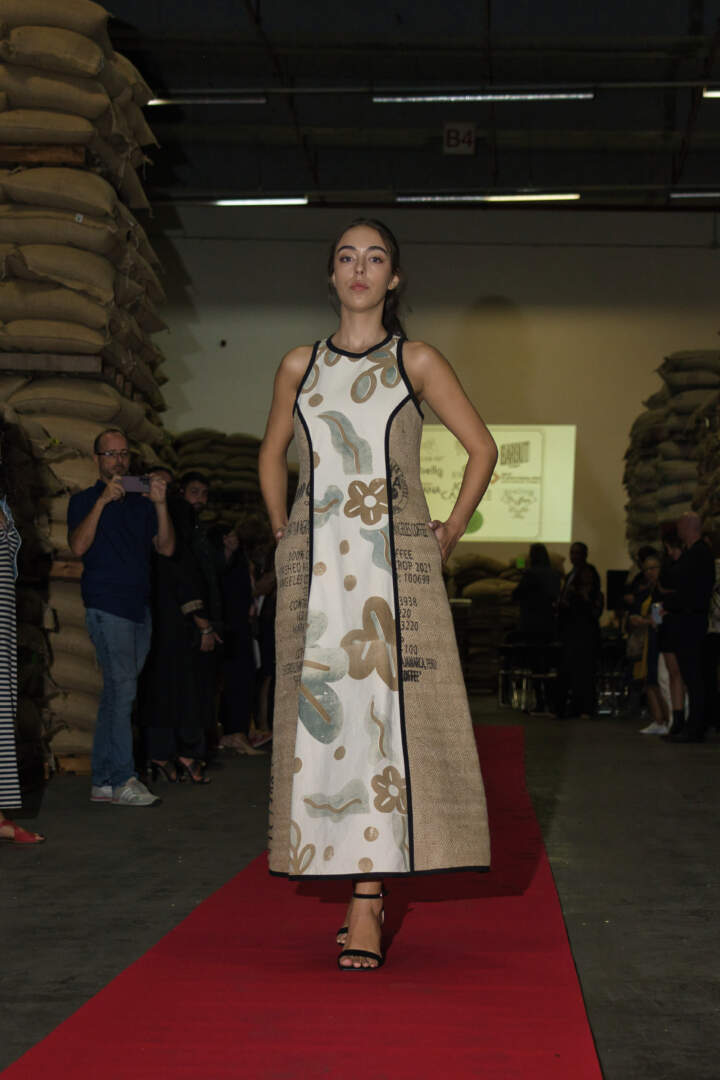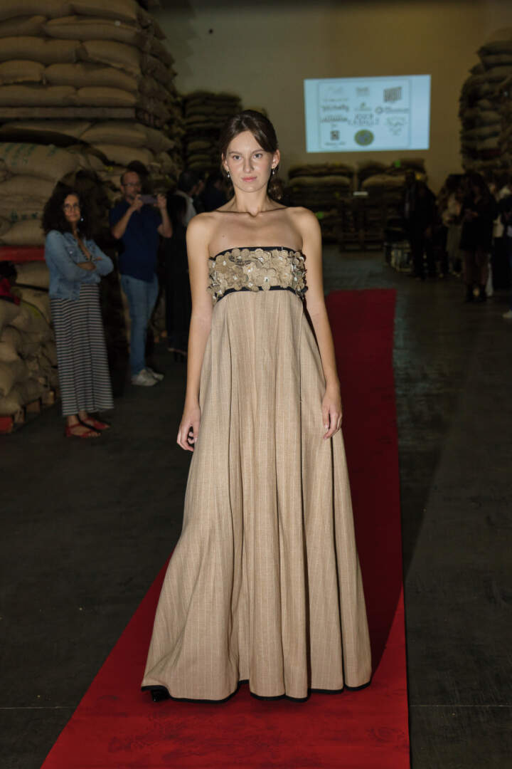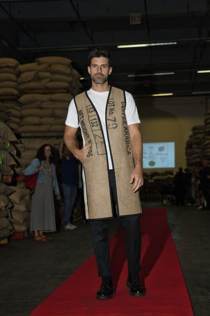 Entre los sacos de café y el entorno industrial, el desfile fue una auténtica celebración del diseño consciente, mostrando cómo cada saco de café cobra una nueva vida, contando una nueva historia a través de la moda responsable y vanguardista.